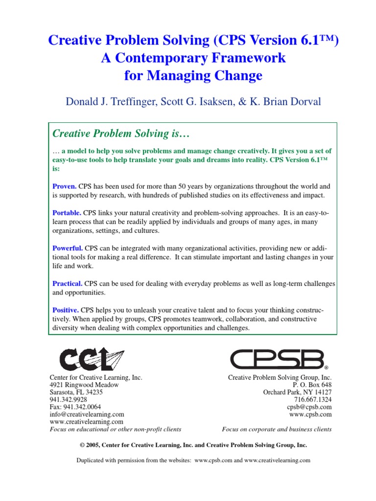 (1997), the creative problem solving framework : And an organisation of a certain tenure (and depending on their flexibility in regards to change) will have processes created aeons ago that need improving. Creative approaches to problem solving: Note 1 (isaksen and treffinger 1987) changed their description of the cps framework to include these three components of activity as well as the six van gundy(1985) presents number of analytical techniques. J treffinger 1985 creative problem solving: (isaksen and treffinger 1987) changed their description of the cps framework to include these three components of activity as well as the six stages. Approaches to assist in the evaluation and refinement of ideas and/or solutions include • using a comprehensive checklist to assess the viability of ideas (isaksen and treffinger, 1985). Treffinger received the nagc distinguished service award in 1984 and the e. Isaksen, dorval and treffinger devise a way to help. .the leader who draws out, reinforces and facilitates the creative learning, development and problem solving of the people with whom he or she is working. The basic course, buffalo, ny. • the process was developed and elaborated by parnes (1981) and later by isaksen and treffinger (1985). Our view of cps (isaksen & treffinger, 1985) outlines three main components for cps.